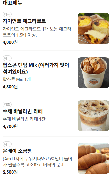 - 에그타르트: 4,000원 / 믹스맛 팝스콘: 4,800원